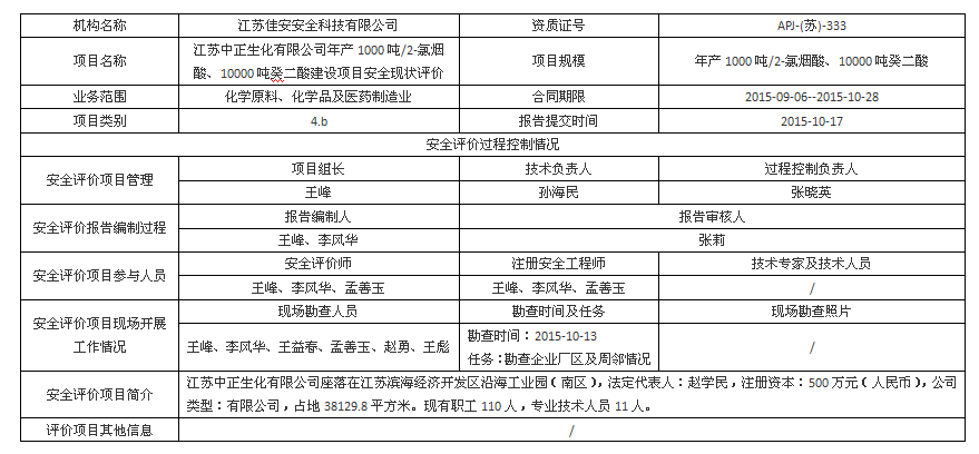 江蘇中正生化有限公司 年產(chǎn)1000噸/2-氯煙酸、10000噸癸二酸建設(shè)項(xiàng)目安全現(xiàn)狀評(píng)價(jià)