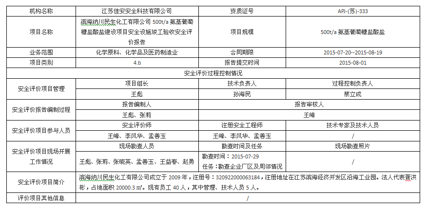 濱海納川民生化工有限公司 500t/a氨基葡萄糖鹽酸鹽建設(shè)項(xiàng)目安全設(shè)施竣工驗(yàn)收安全評(píng)價(jià)報(bào)告