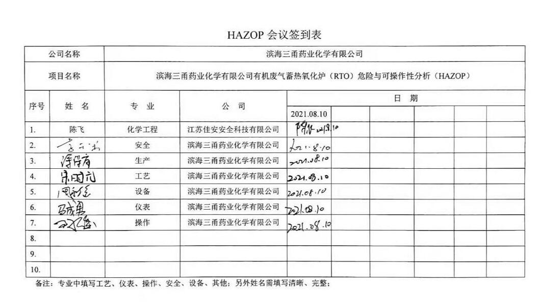 濱海三甬藥業(yè)化學(xué)有限公司12000Nm3/h有機(jī)廢氣蓄熱氧化爐(RTO)危險(xiǎn)與可操作性分析(HAZOP)報(bào)告 | |||